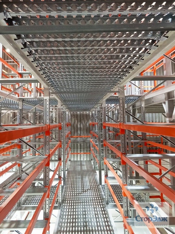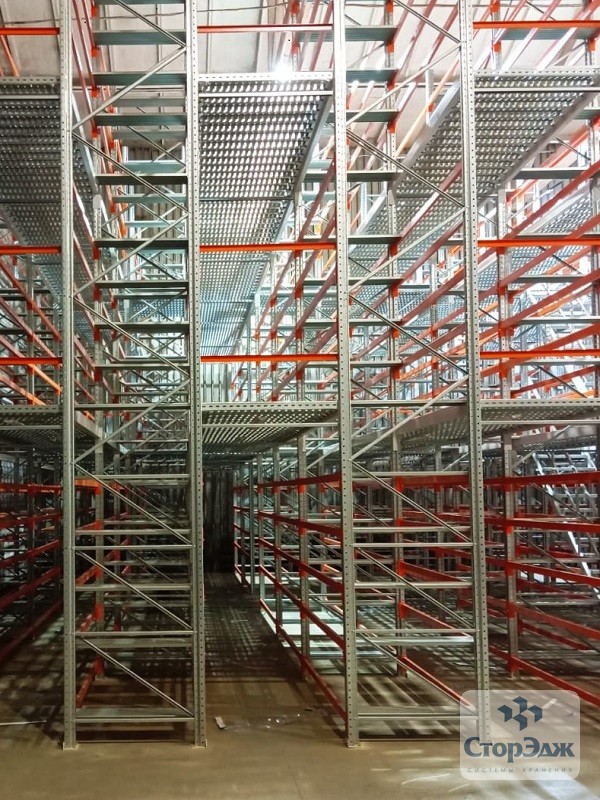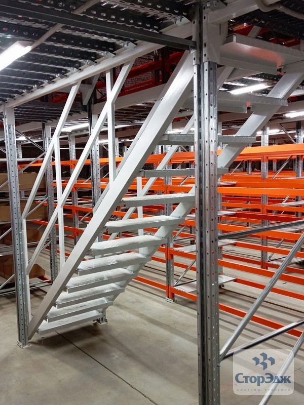 В данном проекте использованы типовые, хорошо зарекомендовавшие себя решения: проливные полы, рамы П90, сварные лестницы, балки с закрытым профилем, ранее упоминавшиеся блоки безопасной загрузки (паллетные ворота). Особенностью данной комплектации явилось желание заказчика использовать ламинированный настил, который он приобретал самостоятельно. Мы же изготовили под него поперечные балки (связь под полку ДСП) с учетом нагрузки и размеров самого настила.