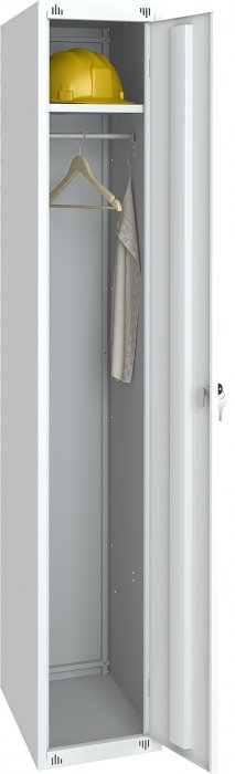 Односекционный металлический шкаф для одежды предназначен для хранения сменной одежды в спортивных и образовательных заведений, а также для организации раздевалок в общепите и на производстве.  Шкаф комплектуется врезным замком, полкой и перекладиной для вешалки. Шкаф окрашен порошковой краской цвет – RAL7035. Двери шкафа снабжены ребром жесткости, что обепечивает дополнительное удобство и увеличенный срок эксплуатации. Вентиляционная перфорация выполнена на лицевой стороне корпуса шкафа. Шкаф поставляется в разобранном виде. Есть возможность поставки в собранном виде (стоимость уточняйте у менеджера).